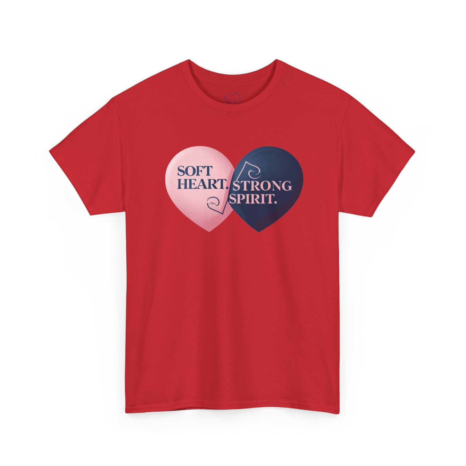 This tee carries a quiet power: two overlapping hearts — one soft pink that reads “Soft Heart,” the other deep navy declaring “Strong Spirit.” It looks simple at first, then settles in like a gentle reminder you can wear. The classic crew cut and relaxed fit make it a go-to layering piece for slow mornings, coffee shop afternoons, or evenings around a friend’s living room. The fabric feels steady and familiar against the skin; the message sits close to the chest, the kind of small affirmation that grows truer each time you put it on. It’s for people who balance tenderness with resolve, who want clothing that speaks in calm confidence rather than loud slogans. Wear it when you need quiet encouragement, to mirror someone else’s strength, or to mark moments of steady resilience.
