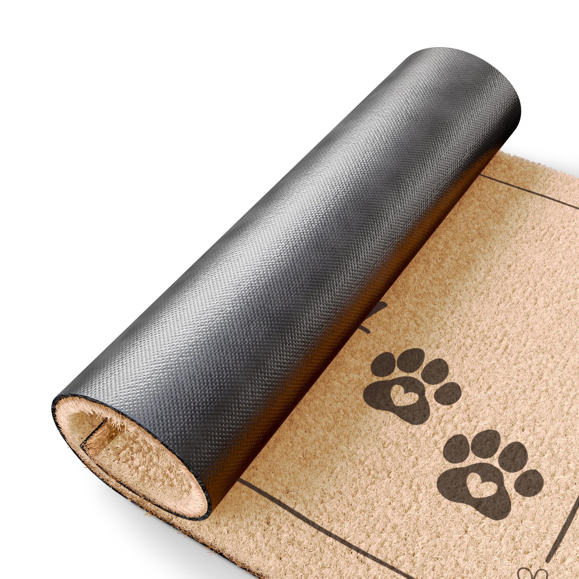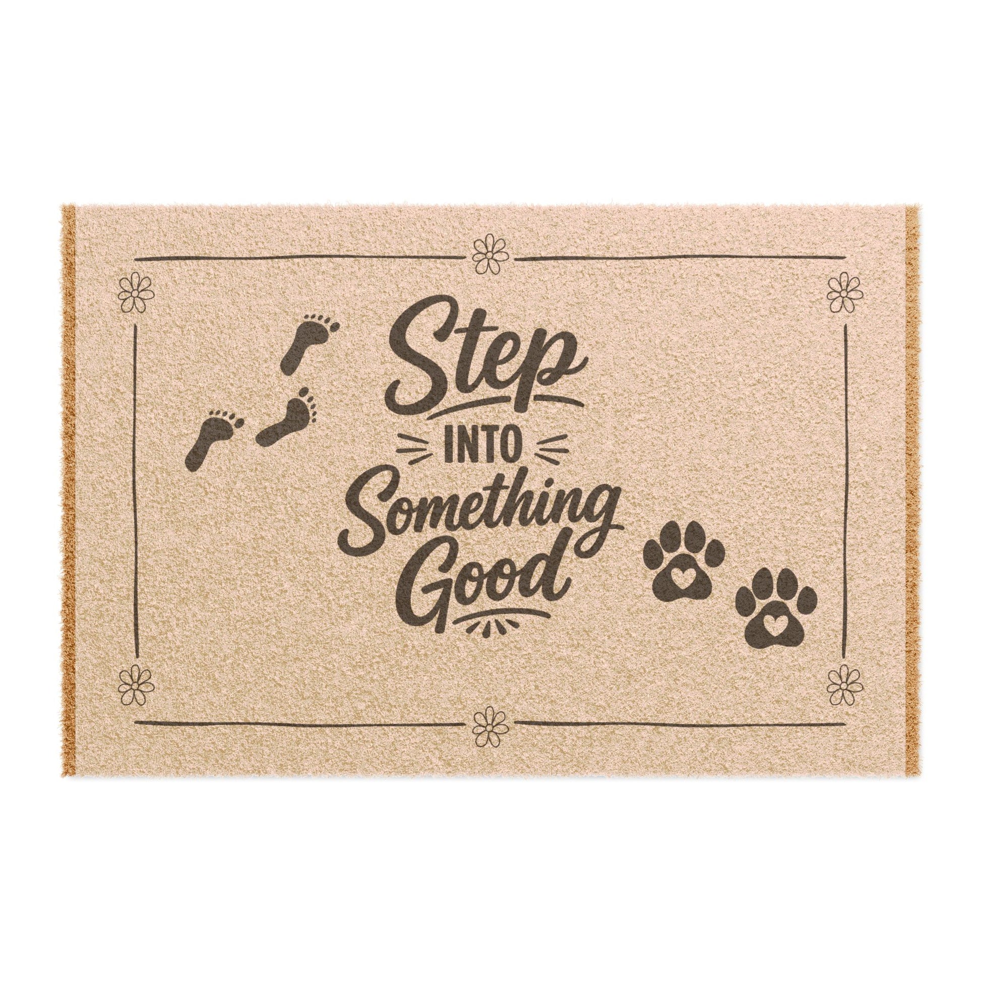 A warm, welcoming coir doormat that greets every visitor with a little optimism. Natural coconut fibers create a rustic, textured surface stamped with cheerful script and playful paw and footprint motifs. It settles easily at your doorstep, brushing dirt from shoes while hinting at the friendly home inside. Durable enough for outdoor use and anchored by a black vinyl non-slip backing, this mat stays put through comings and goings and changing weather. The subtle border and floral corner accents give it a handcrafted look that pairs well with porches, mudrooms, and pet-loving households. Arrives ready to place — a simple touch that sets a positive tone before the door even opens.