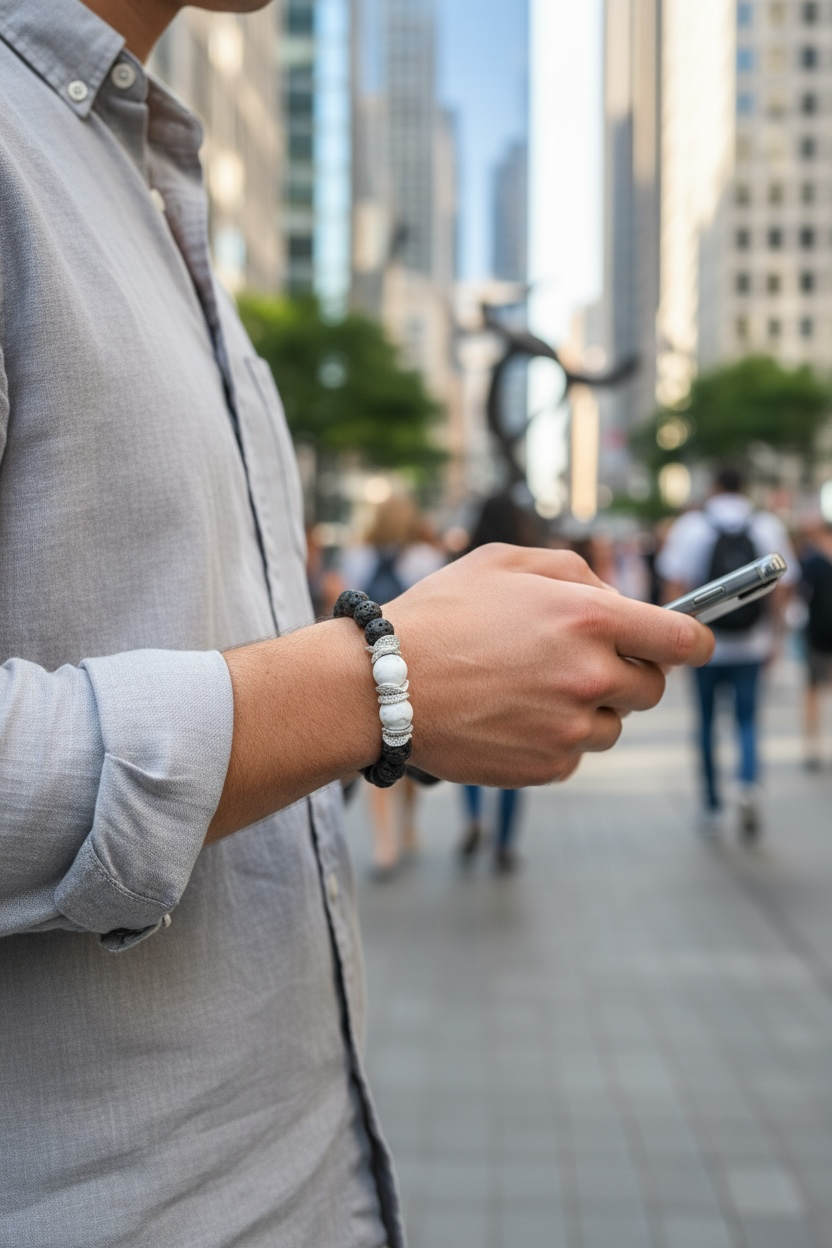 This handcrafted stretch bracelet combines the primal energy of lava stone with the soothing calm of howlite, creating the perfect union of fire and serenity. Earthy and understated, this piece is ideal for daily wear, meditation, or mindful gifting.